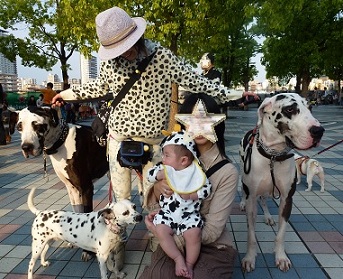 牛柄のグレートデンを連れていた飼い主さんは、牛柄がお好きだそうで、ご自身も牛柄の服。