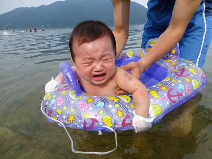初めての冷たい水に、ハルはびっくり! 大泣き(笑)