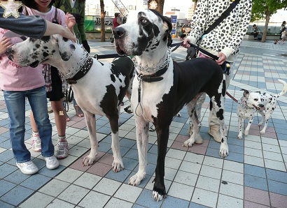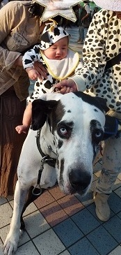 牛柄のグレートデンを連れていた飼い主さんは、牛柄がお好きだそうで、ご自身も牛柄の服。